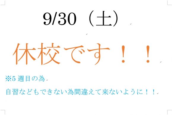 9/30 休校です!!